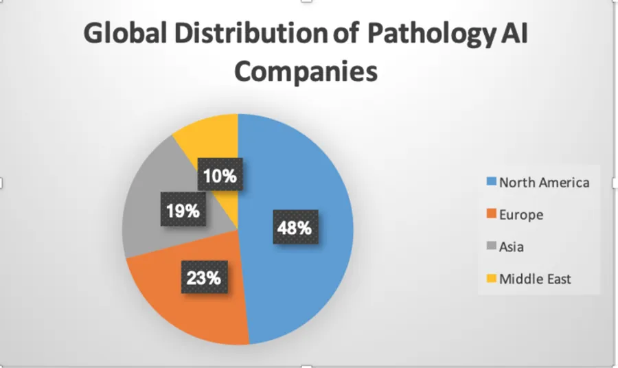 Pathology companies that are developing artificial intelligence algorithms on whole slide images from patient biopsies are popping up everywhere and all the time. These companies state that they want to improve healthcare by improving pathology diagnoses. Since the number of pathologists throughout the world is insufficient and the number of pathology biopsies and resections is increasing, Artificial Intelligence is one way to automate the tedious and boring aspects of pathology to free up pathologists’ time for more difficult interpretations. The companies claim that AI will improve the detection of disease and the standardization of tumor grading. These companies range from well-funded startups to giant internet companies, such as Google and Baidu. There are over 30 companies around the world that profess to be performing artificial intelligence on digital pathology. Almost half of these companies are in the USA and Canada, Twenty-three percent are in Europe (UK, Ireland, Germany, Denmark, Sweden Norway and Finland). Nineteen percent are in Asia (Korea, India, China, Taiwan) and ten percent are in Israel.